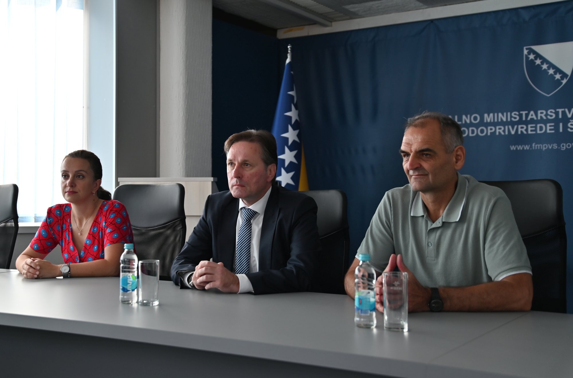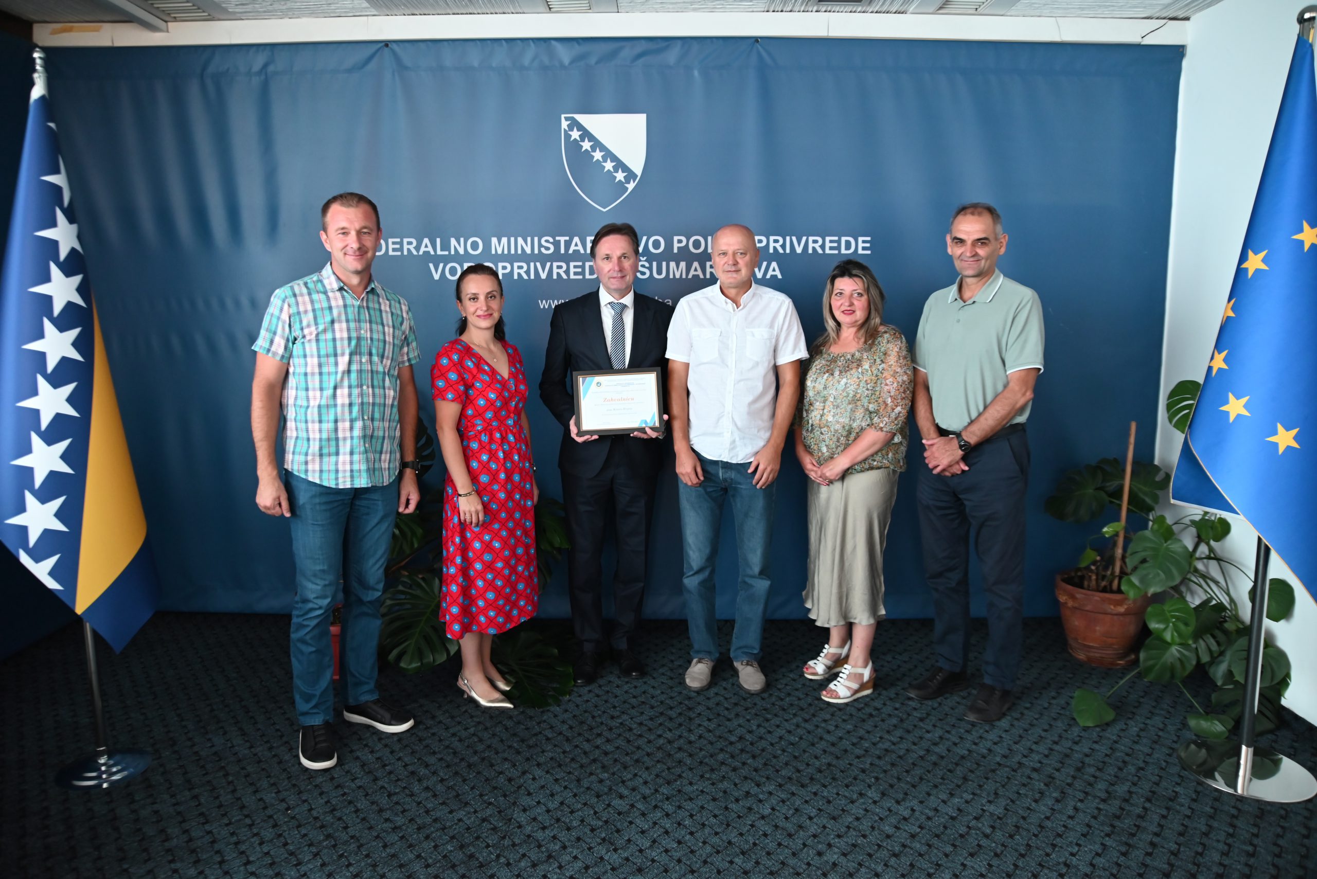 Zahvalnicu ministru Hrnjiću uručio je Emir Raščić, predsjednik Sindikalnog odbora Federalnog ministarstva poljoprivrede, vodoprivrede i šumarstva.