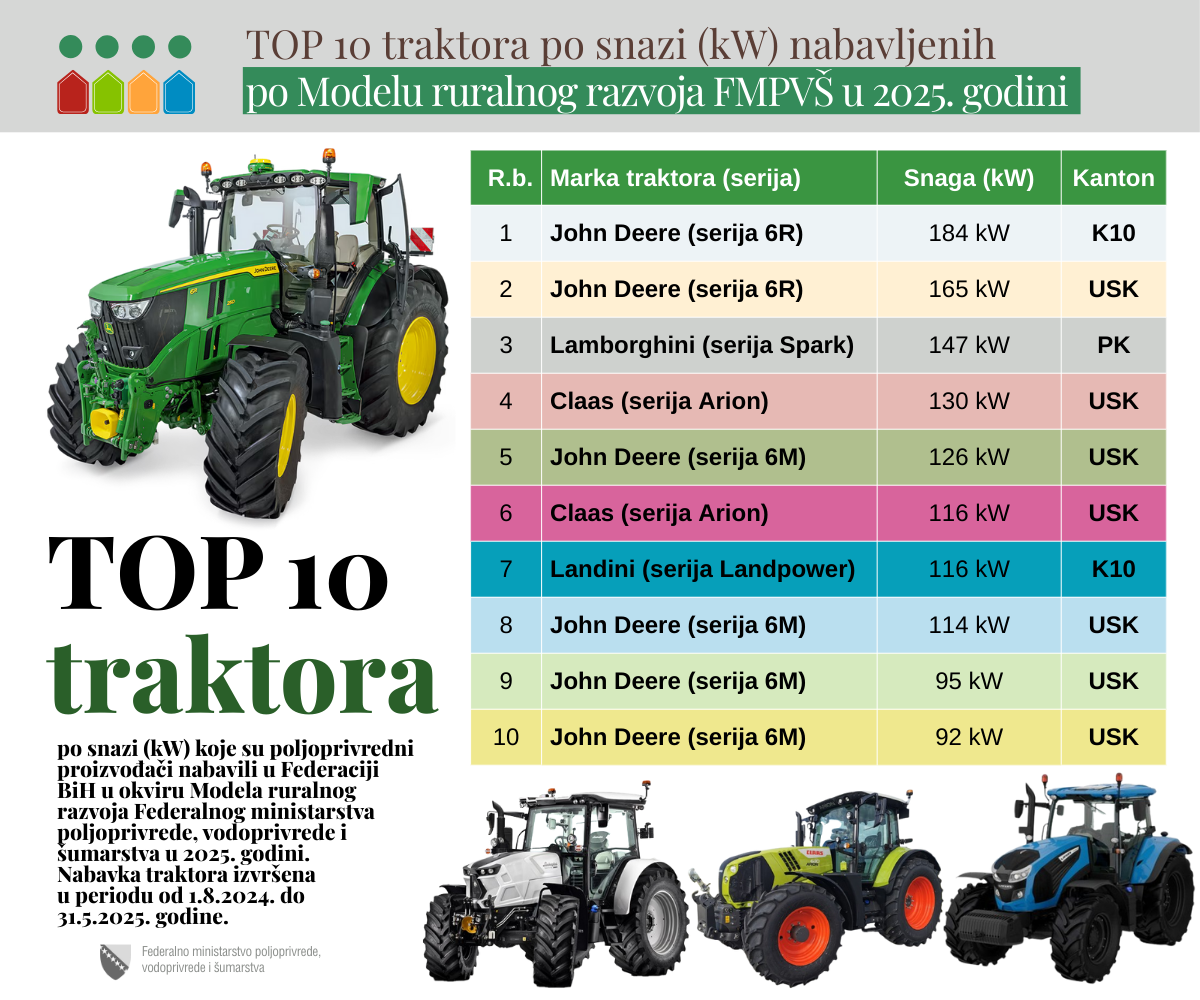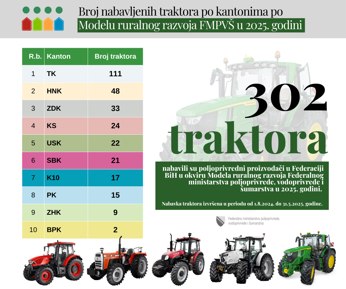 Federalno ministarstvo poljoprivrede, vodoprivrede i šumarstva, u okviru Modela ruralnog razvoja, u 2025. godini podržalo je nabavku ukupno 302 traktora za poljoprivredne proizvođače širom Federacije BiH.