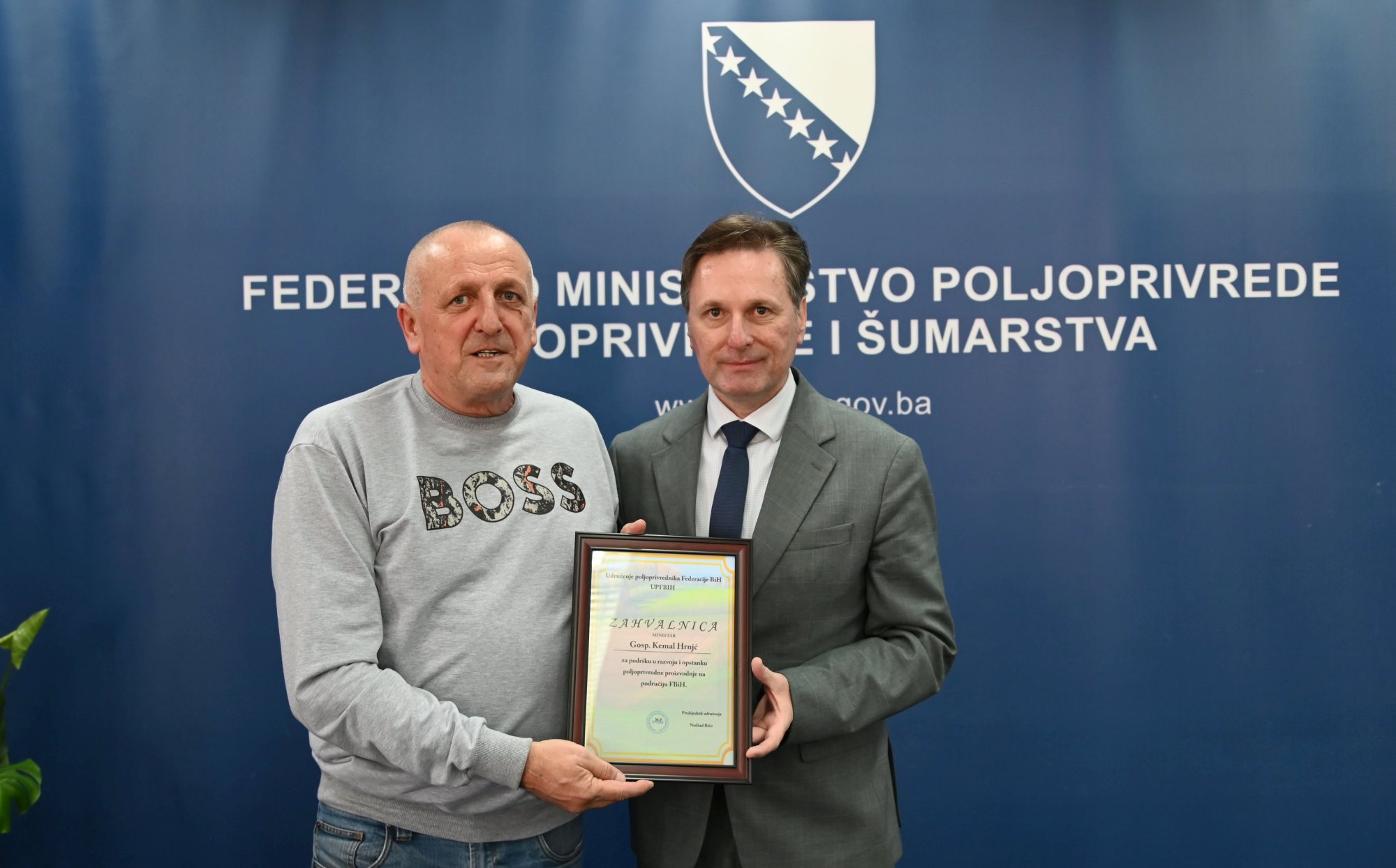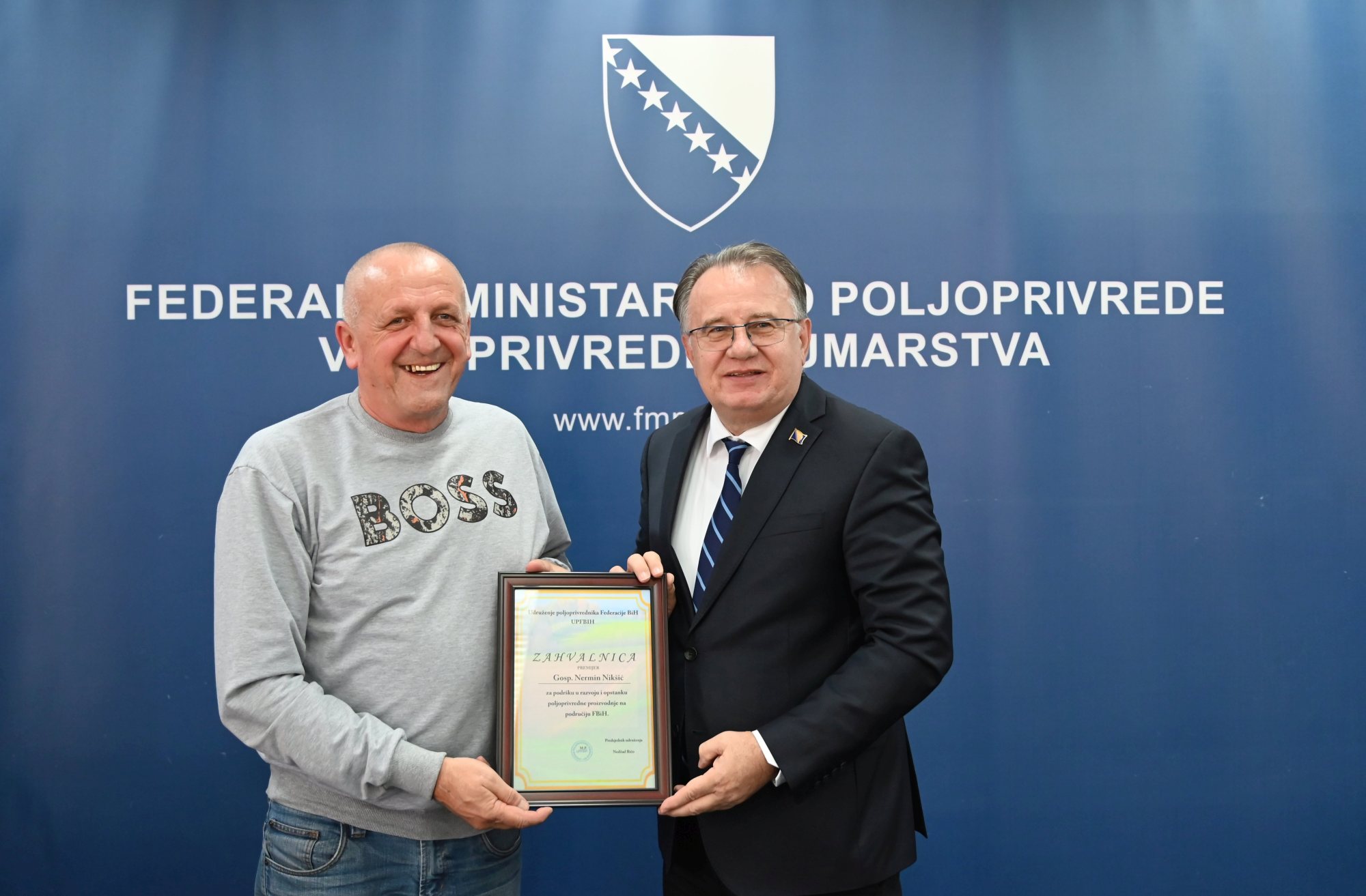 Predstavnici Udruženja poljoprivrednika Federacije BiH danas su u sjedištu Vlade Federacije Bosne i Hercegovine u Sarajevu uručili premijeru Federacije BiH Nerminu Nikšiću i federalnom ministru poljoprivrede, vodoprivrede i šumarstva Kemalu Hrnjiću zahvalnice za podršku razvoju i opstanku poljoprivredne proizvodnje na području Federacije BiH.